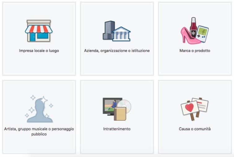 Per creare una Fan Page aziendale devi iscriverti con un profilo personale e poi andare su facebook.com/pages/create. Questo è il punto di partenza per iniziare la tua avventura con uno strumento pensato per ottenere il massimo. Poi c’è uno dei passaggi essenziali per il tuo futuro della tua realtà online: devi scegliere il tipo di pagina in base all’attività svolta. Ecco un esempio concreto.